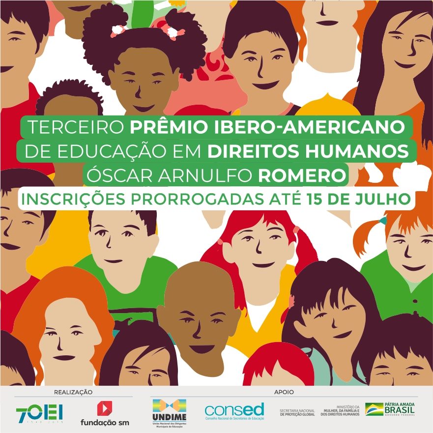As inscrições para a etapa nacional do Prêmio Internacional de Educação em Direitos Humanos Óscar Arnulfo Romero foram prorrogadas até 15 de julho. Promovida pela Fundação SM e a Organização dos Estados Ibero-americanos para Educação, Ciência e Cultura (OEI), com apoio do Conselho Nacional de Secretários de Educação (Consed), da União Nacional dos Dirigentes Municipais de Educação (Undime) e da Secretaria Nacional de Proteção Global, do Ministério da Mulher, da Família e dos Direitos Humanos, a premiação reconhece a atuação de escolas e organizações da sociedade civil (OSC), que desenvolvem programas com foco no direito à educação, à convivência na escola, à paz, às liberdades, à inclusão e aos direitos humanos.