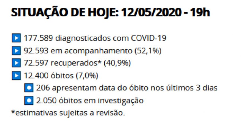 Os dados foram atualizados até as 19h desta terça-feira (12/5) com informações repassadas pelas Secretarias Estaduais de Saúde.